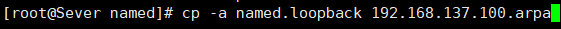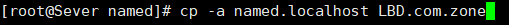 进入到此目录中后,我们要先敲打图中的命令,cp -a 意味着将named.localhost 全盘复制,无论是权限还是内容都会全盘复制,这一步很重要!!!并且还需要注意 这里的文件名要与你在搭建正向解析服务器中的 file 文件名相同
