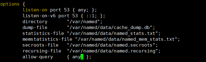 在这一步我们需要将 监听接口改成 any;这意味着我们能监听到任何在我们服务器中的客户端,也就是说我们能给客户端安排一个服务员,然后将 allow-query 也要改成 any;这就意味着在服务器中的客户端都能给它提供服务。