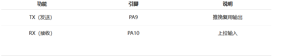 {/* 开启时钟 */RCC_APB2PeriphClockCmd(RCC_APB2Periph_USART1, ENABLE);RCC_APB2PeriphClockCmd(RCC_APB2Periph_GPIOA, ENABLE);/* 配置 TX 引脚 PA9 为复用推挽输出 */GPIO_InitTypeDef GPIO_InitStructure;GPIO_InitStructure.GPIO_Mode = GPIO_Mode_AF_PP;GPIO_InitStructure.GPIO_Pin = GPIO_Pin_9;GPIO_InitStructure.GPIO_Speed = GPIO_Speed_50MHz;GPIO_Init(GPIOA, &GPIO_InitStructure);/* 配置 RX 引脚 PA10 为上拉输入 */GPIO_InitStructure.GPIO_Mode = GPIO_Mode_IPU;GPIO_InitStructure.GPIO_Pin = GPIO_Pin_10;GPIO_Init(GPIOA, &GPIO_InitStructure);/* USART 参数配置 */USART_InitTypeDef USART_InitStructure;USART_InitStructure.USART_BaudRate = 9600; // 波特率USART_InitStructure.USART_HardwareFlowControl = USART_HardwareFlowControl_None;USART_InitStructure.USART_Mode = USART_Mode_Tx | USART_Mode_Rx; // 启用收发模式USART_InitStructure.USART_Parity = USART_Parity_No;USART_InitStructure.USART_StopBits = USART_StopBits_1;USART_InitStructure.USART_WordLength = USART_WordLength_8b;USART_Init(USART1, &USART_InitStructure);/* 开启接收中断 */USART_ITConfig(USART1, USART_IT_RXNE, ENABLE);/* NVIC 配置 */NVIC_PriorityGroupConfig(NVIC_PriorityGroup_2);NVIC_InitTypeDef NVIC_InitStructure;NVIC_InitStructure.NVIC_IRQChannel = USART1_IRQn;NVIC_InitStructure.NVIC_IRQChannelPreemptionPriority = 1;NVIC_InitStructure.NVIC_IRQChannelSubPriority = 1;NVIC_InitStructure.NVIC_IRQChannelCmd = ENABLE;NVIC_Init(&NVIC_InitStructure);/* 使能 USART1 */USART_Cmd(USART1, ENABLE);