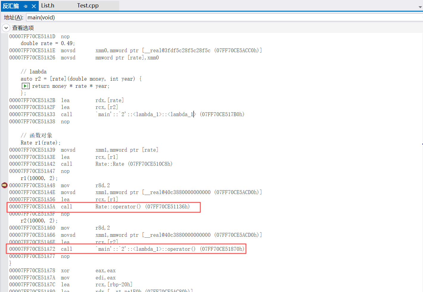 00007FF70CE51A38 nop // 函数对象Rate r1(rate);