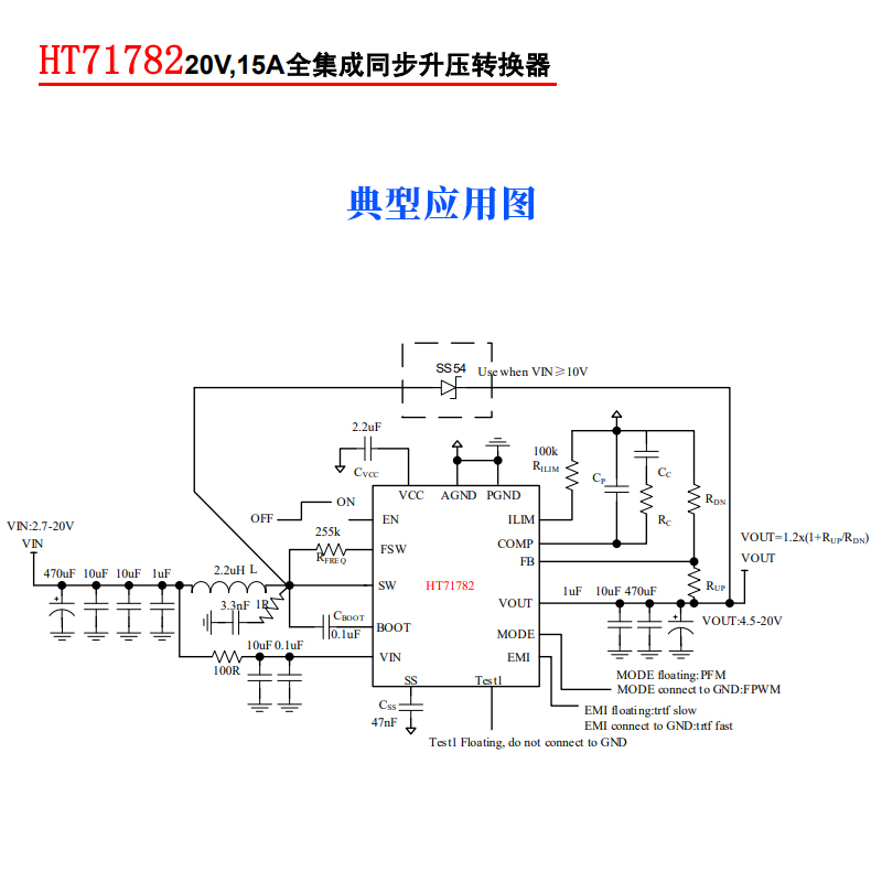 高效的能量转换还离不开智能的工作模式切换机制。HT71778采用自适应恒定关断时间峰值电流控制拓扑结构,能根据负载轻重自动切换工作模式:在中等到重负载场景(如音箱大音量播放、带动高功率音频组件)下,器件自动切换至PWM(脉冲宽度调制)模式,该模式下输出电压稳定、纹波小,能为音频放大器提供平稳的供电环境,从电源层面保障音质的纯净度;在轻负载场景(如小音量播放、设备待机)下,则切换至PFM(脉冲频率调制)模式,通过降低开关频率来减少开关损耗,进一步提升轻载状态下的能效。更具灵活性的是,在PWM模式下,工程师可通过外接电阻自由调节开关频率,范围覆盖200kHz至1.0MHz,既能适配不同的电磁兼容性(EMC)设计要求,又能根据实际需求在效率和干扰控制之间找到最佳平衡点。