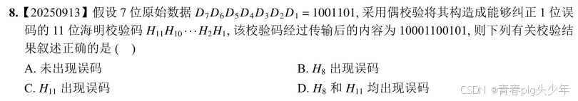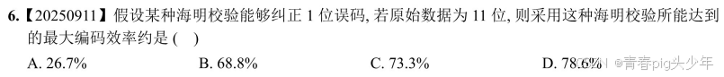我在做的时候只会傻傻的按步骤写,蛮费时间,而且这个流程也没有记得很熟悉。老师还给出了一个方法是构造出来传输前的海明码后直接和题目中的进行对比(且还有在应试过程中如何快速的写出对应的校验组)