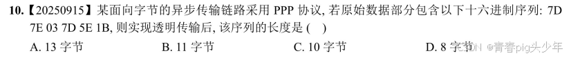 首先PPP(透明传输、全双工、无需CSMA/CD、无最短帧限制、不可靠、支持多网路),再看回本题所考察的关于PPP的透明传输(字节填充)总共分为三个部分:0x7E、0x7D、小于0x20。依次的规则是大于0x20减去0x20,小于0x20加上0x20,最后在前面直接加上0x7D字段