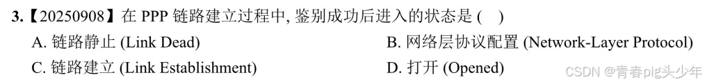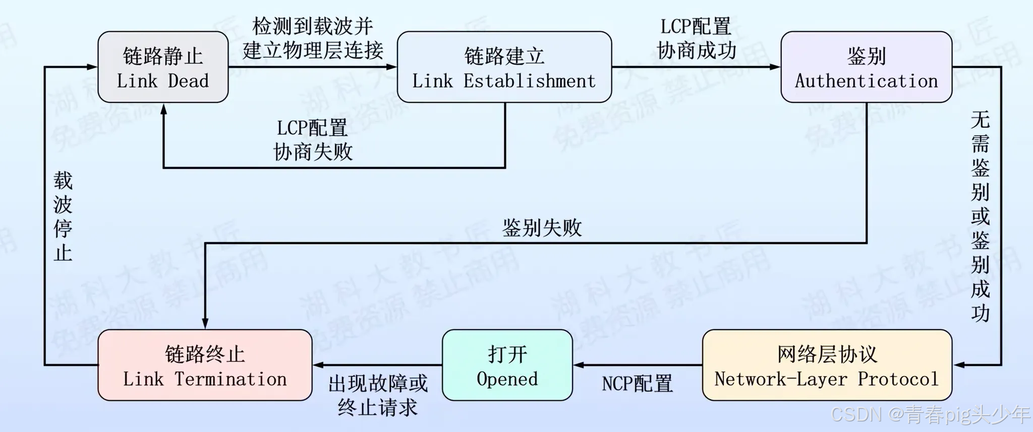 - 链路建立(Link Establishment):通过LCP(Link Control Protocol)协商建立链路。