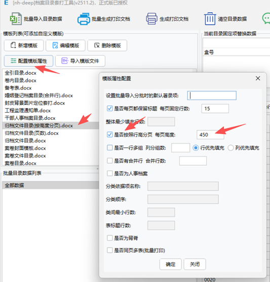 设置模版属性,勾选上按照高度分页,并设置分页高度为450(具体数值按需调整)