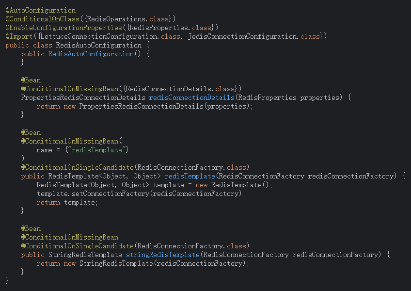 public class RedisConfig {@BeanLettuceConnectionFactory connectionFactory() {return new LettuceConnectionFactory();}@Beanpublic RedisTemplate<String, Object> redisTemplate(RedisConnectionFactory redisConnectionFactory) {RedisTemplate<String, Object> template = new RedisTemplate<>();template.setConnectionFactory(redisConnectionFactory);template.setKeySerializer(new StringRedisSerializer());template.setHashKeySerializer(new StringRedisSerializer());GenericJackson2JsonRedisSerializer jsonSerializer =new GenericJackson2JsonRedisSerializer();template.setValueSerializer(jsonSerializer);template.setHashValueSerializer(jsonSerializer);template.afterPropertiesSet();return template;}