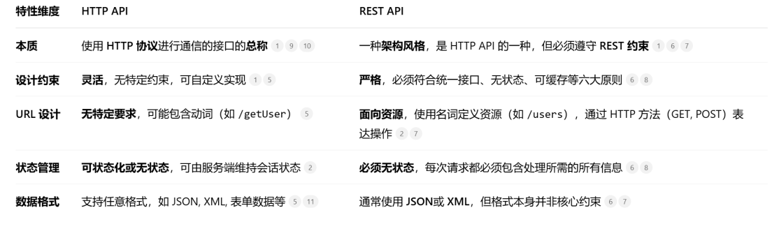 HTTP API | 一个广义概念,指所有基于 HTTP协议的接口。RESTful API 是其中一种重要形式,但 HTTP API 也可能包括不完全符合 REST 约束的设计。 | 作为 Web 服务的基础通信手段,覆盖范围非常广泛。 |