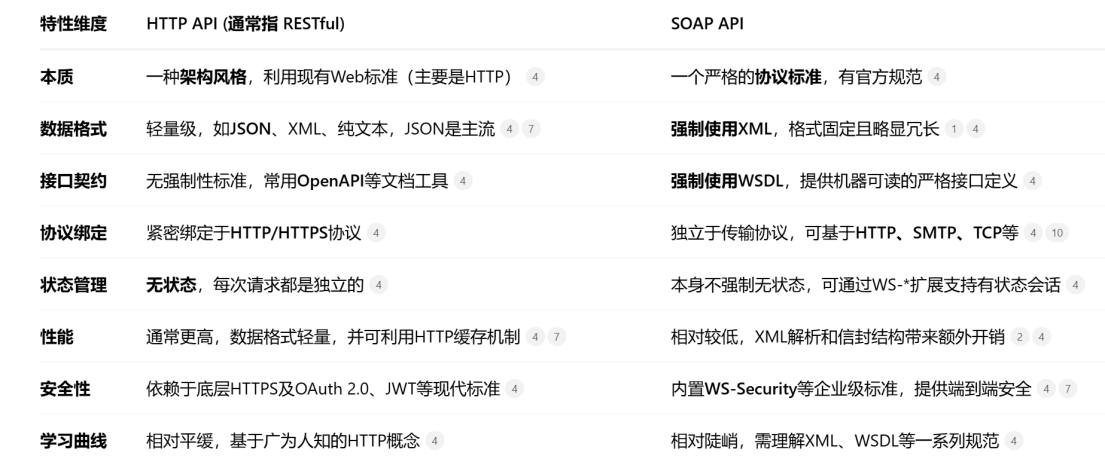 - HTTP API (RESTful) 以其简单、灵活和高效的特点,已成为现代 Web 服务和移动应用后端的主流选择。而 SOAP 在需要企业级特性(如严格的安全、事务和可靠消息)的场景中依然具有不可替代的价值。