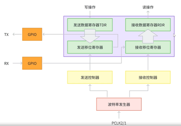 如果外界有数据进来,通过复用RX的GPIO口移到到接收移位寄存器,接收移位寄存器再转运到RDR,外面就能把数据读走了