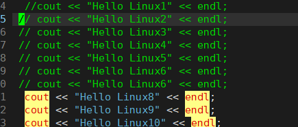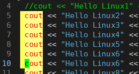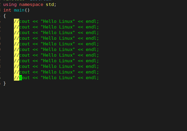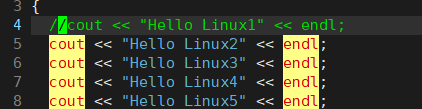 但是你要是想一次注释多行,就得使用ctrl+v进入V-BLOCK模式,然后选择你要注释的那些行,shift+i进入INSERT模式,之后//,esc。就可以了