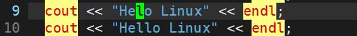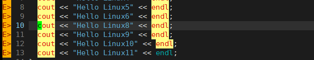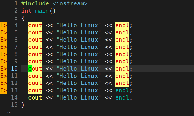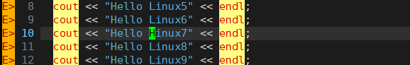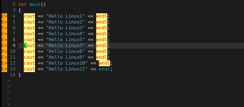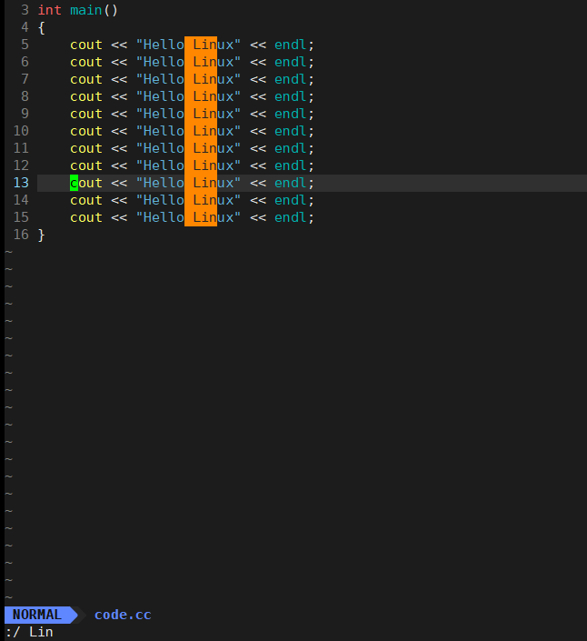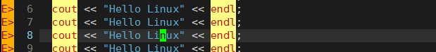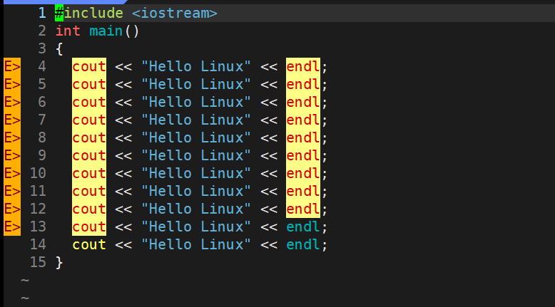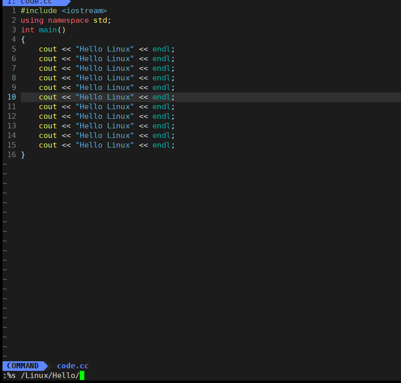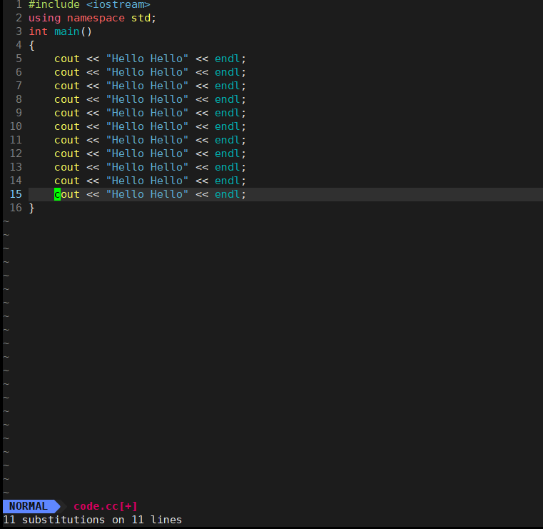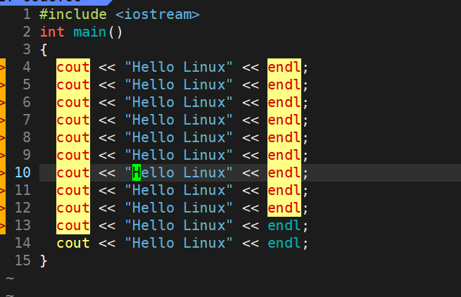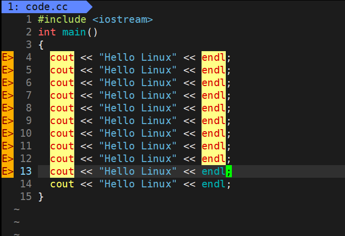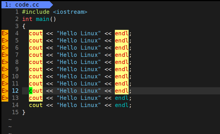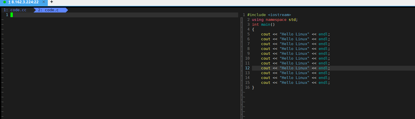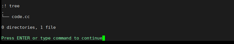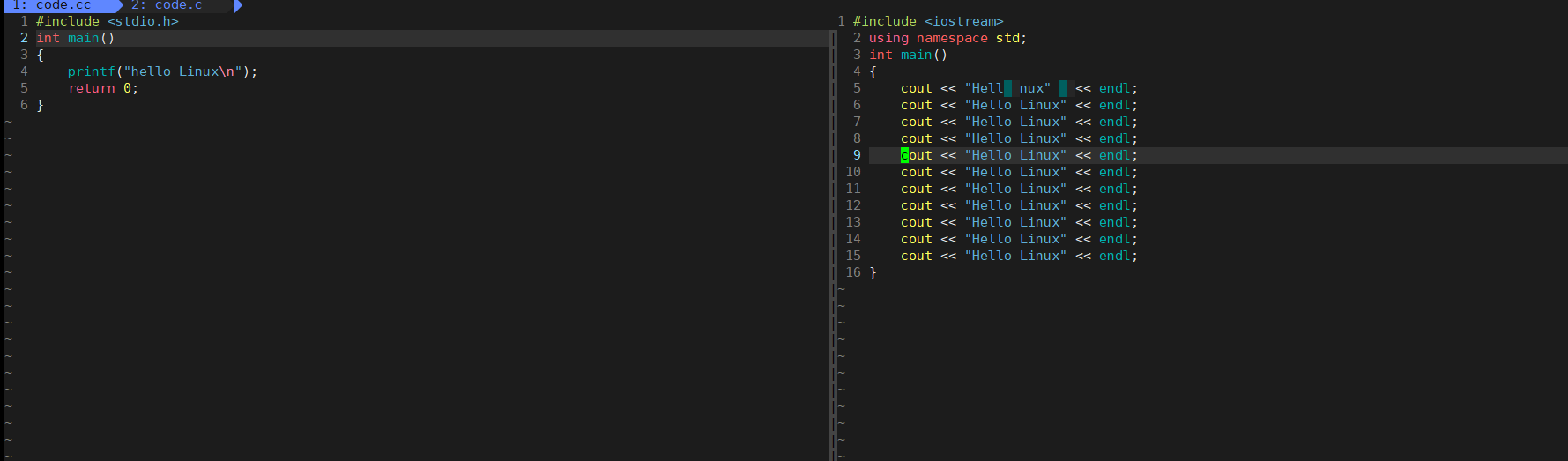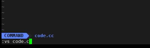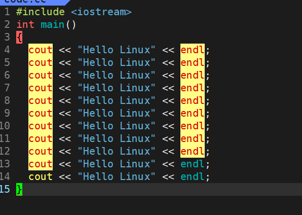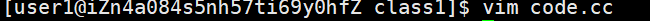 编写程序,之后切换到命令模式ctrlww切换光标到code.cc文件中