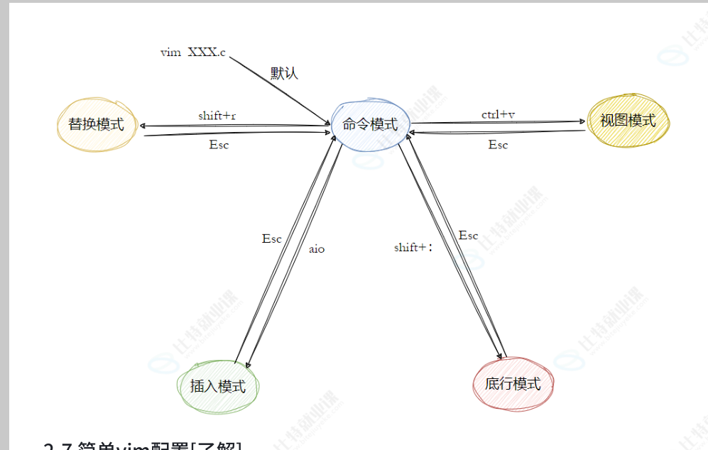 在命令模式下,*shift+:*(就是:) 即可进⼊该模式。要查看你的所有模式:打开 vim,底⾏模式直接输⼊,下面附上关系图
