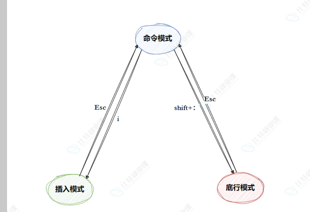 课我们讲解vim的三种模式(其实有好多模式,⽬前掌握这3种即可),分别是命令模式(commandmode)、插⼊模式(Insert mode)和底⾏模式(last line mode),各模式的功能区分如下: