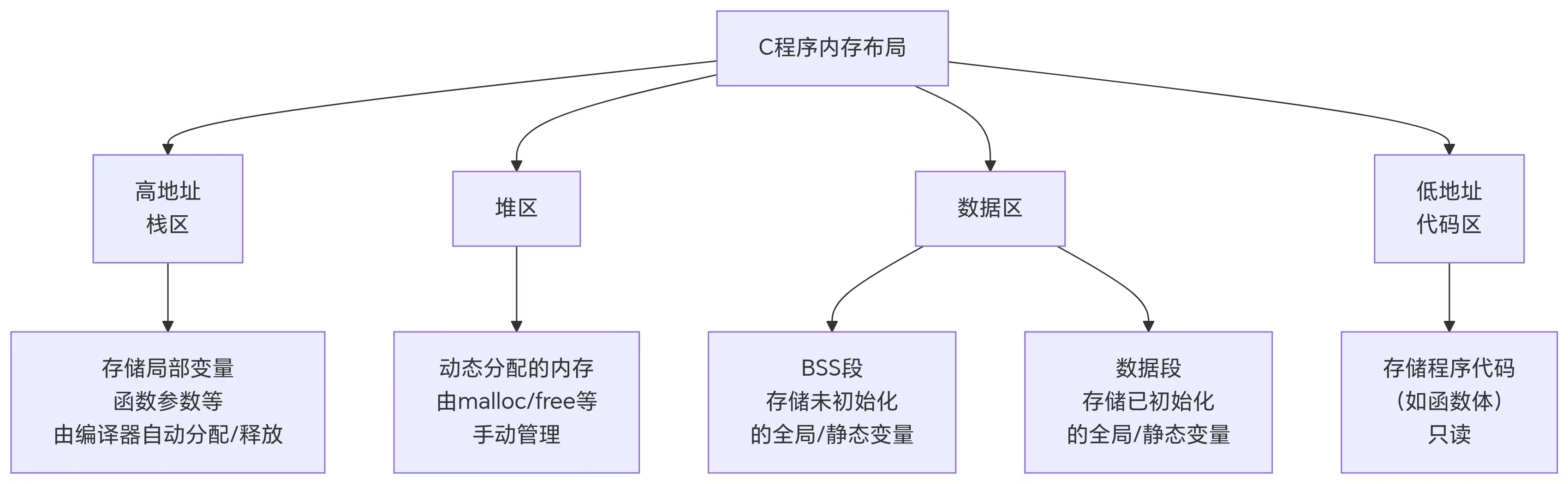 | BSS段 | 未初始化的全局变量/静态变量 | 程序整个生命周期 | 编译器管理 |