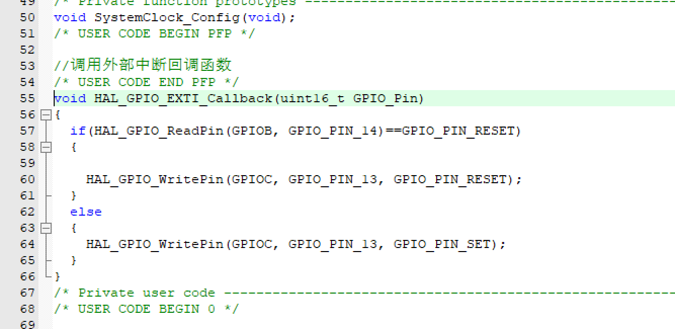 实现功能按键控制开发板上的灯闪烁 stm32DShanMCU-F103按键是PB14, 灯是PC13,按键按下触发中断,灯亮,松开按键触发中断,灯灭