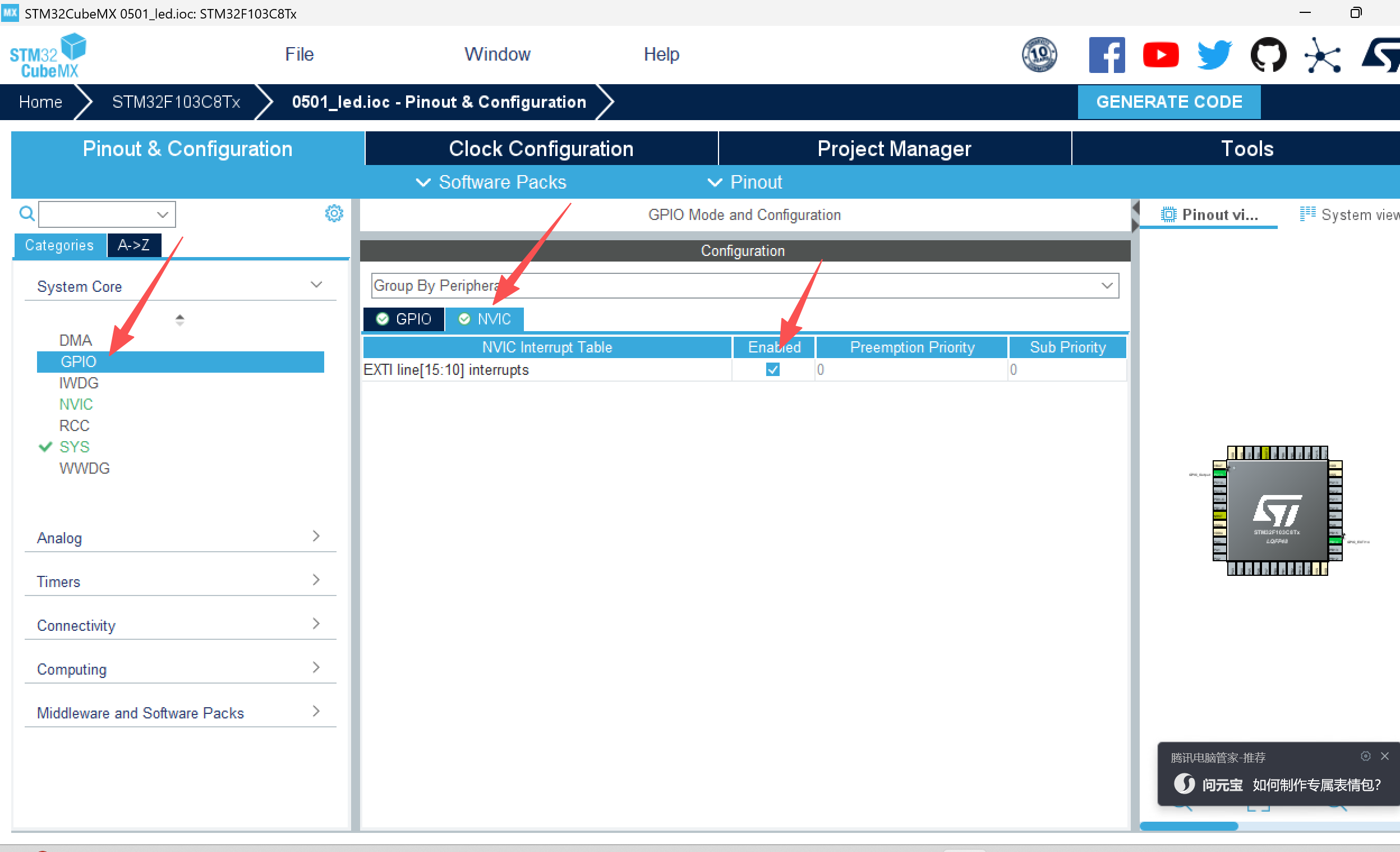 GPIO中断实现的流程:GPIO外部引脚电平发生跳变触发EXTI中断(包含上升沿触发,下降沿触发,双边沿触发)触发后的信号传送到NVIC,NVIC设置中断优先级包含抢占优先级和分组优先级,同时进行使能(使能的含义就是允许中断触发的信号进入CPU),同时把中断向量表给CPU,CPU根据中断的优先级去处理各个中断。