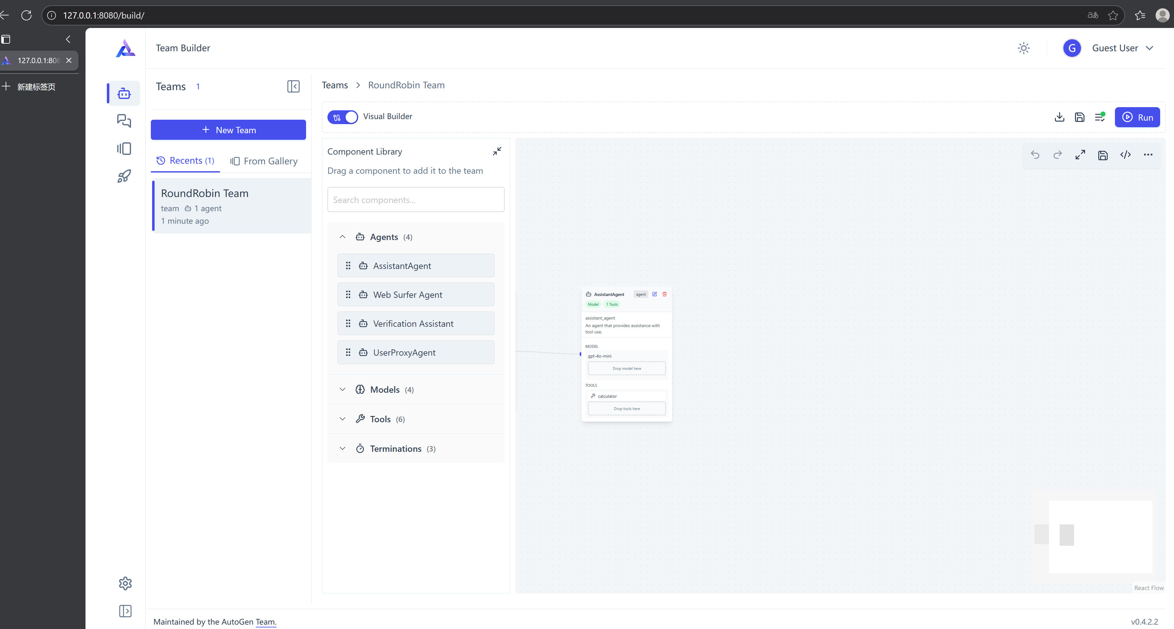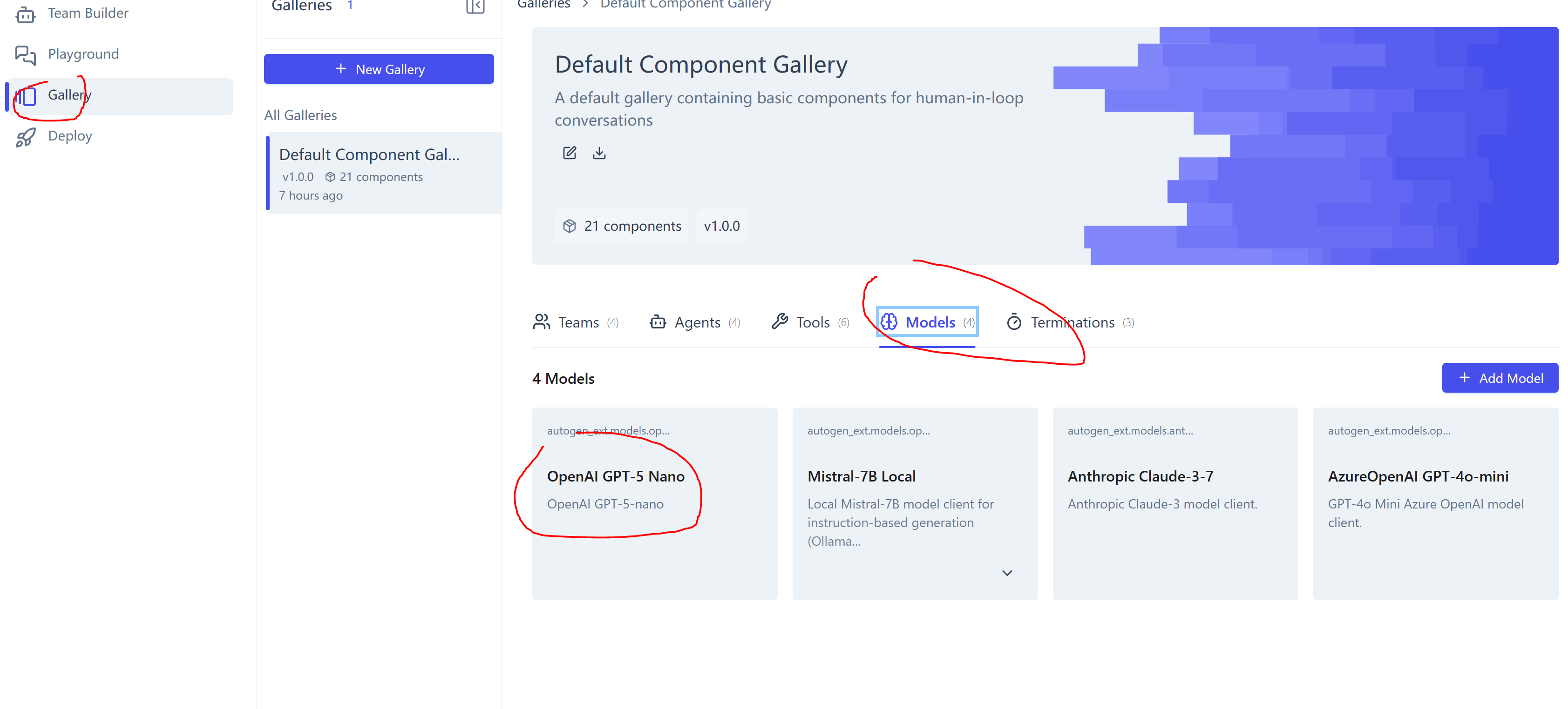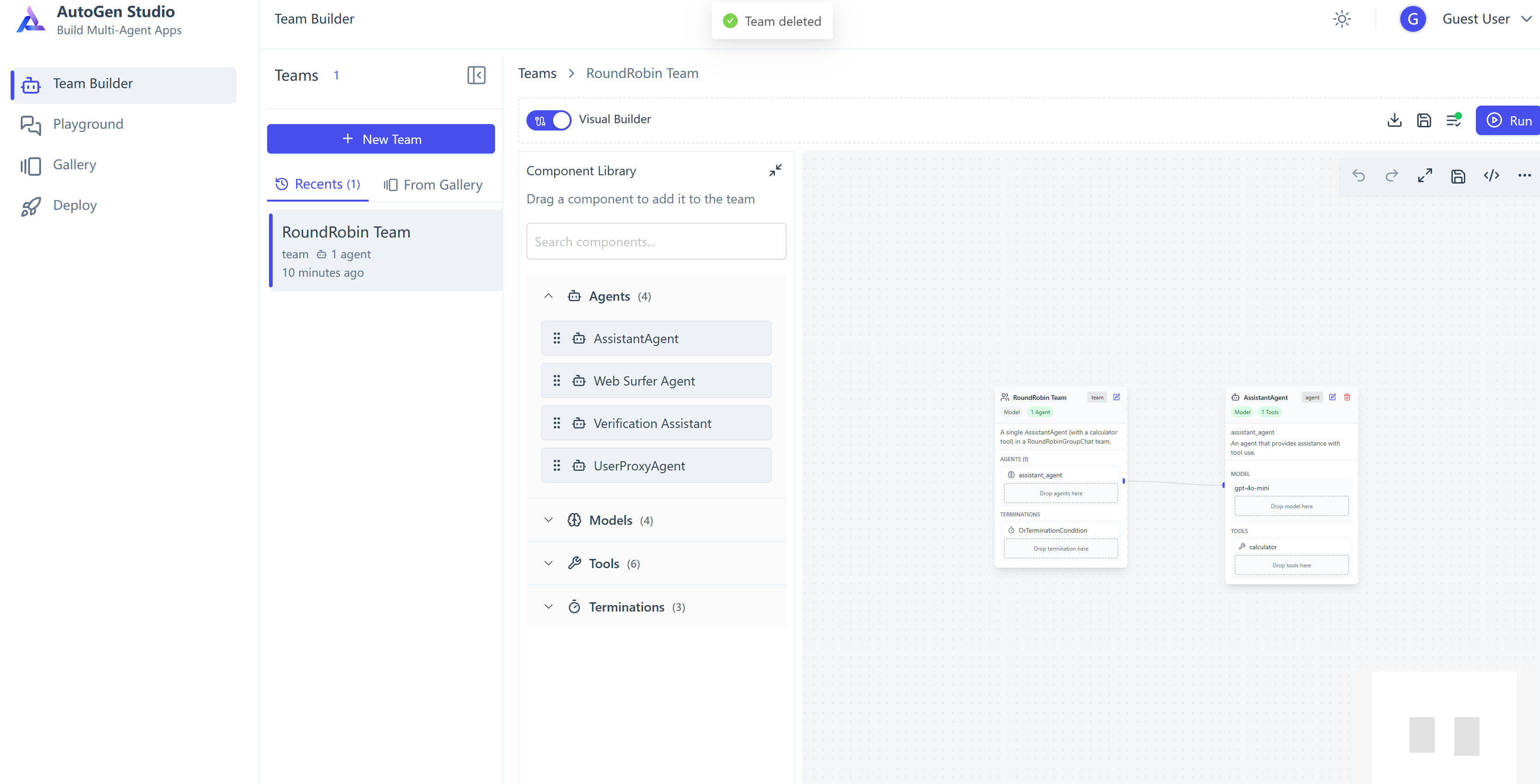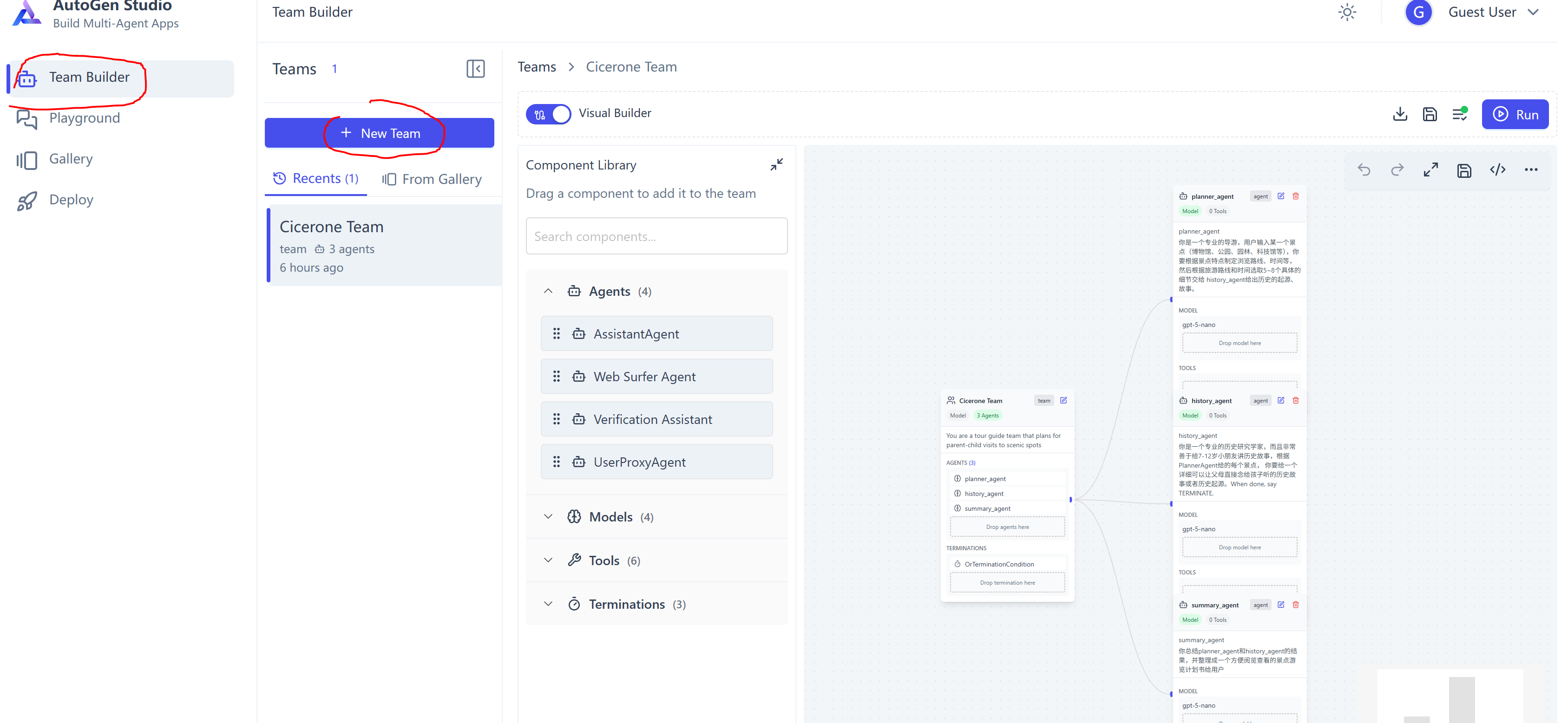 先看侧边栏的 Team Builder / Playground / Gallery / Deploy 都是做什么的: