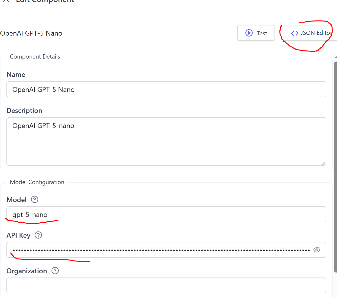 {"provider": "autogen_ext.models.openai.OpenAIChatCompletionClient","component_type": "model","version": 1,"component_version": 1,"description": "OpenAI GPT-5-nano","label": "OpenAI GPT-5 Nano","config": {"model": "gpt-5-nano","api_key": "sk-proj-xxx","model_info": {"vision": "False","function_calling": "True","json_output": "False","family": "unknown","structured_output": "True"}}