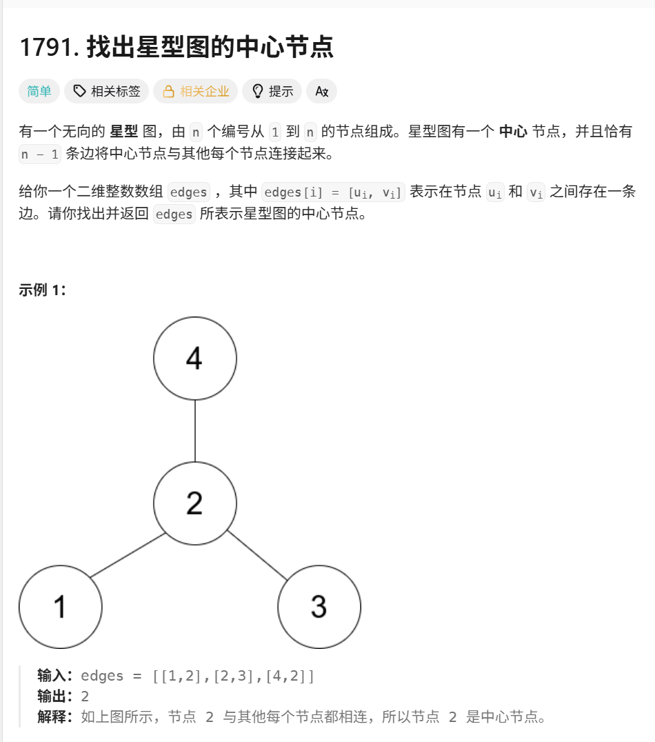 这是一个“万金油”解法,它不依赖“星型图”的特殊性,只要是找“度”最大的节点(在本题中恰好是