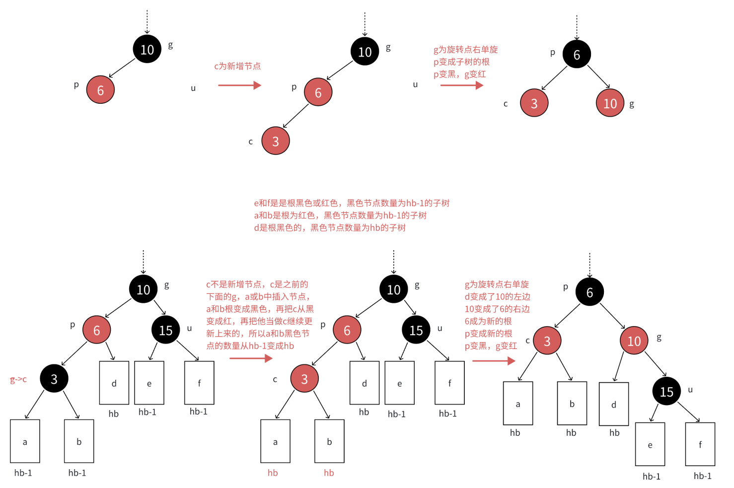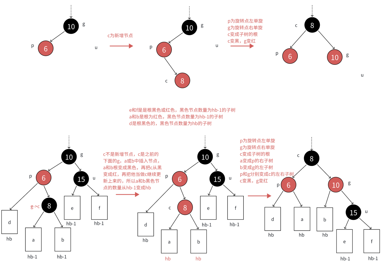 做法:不管增加的结点,或者变红的结点在p的什么位置,将p和u变⿊,g变红。在把g当做新的c,继续往上更新。