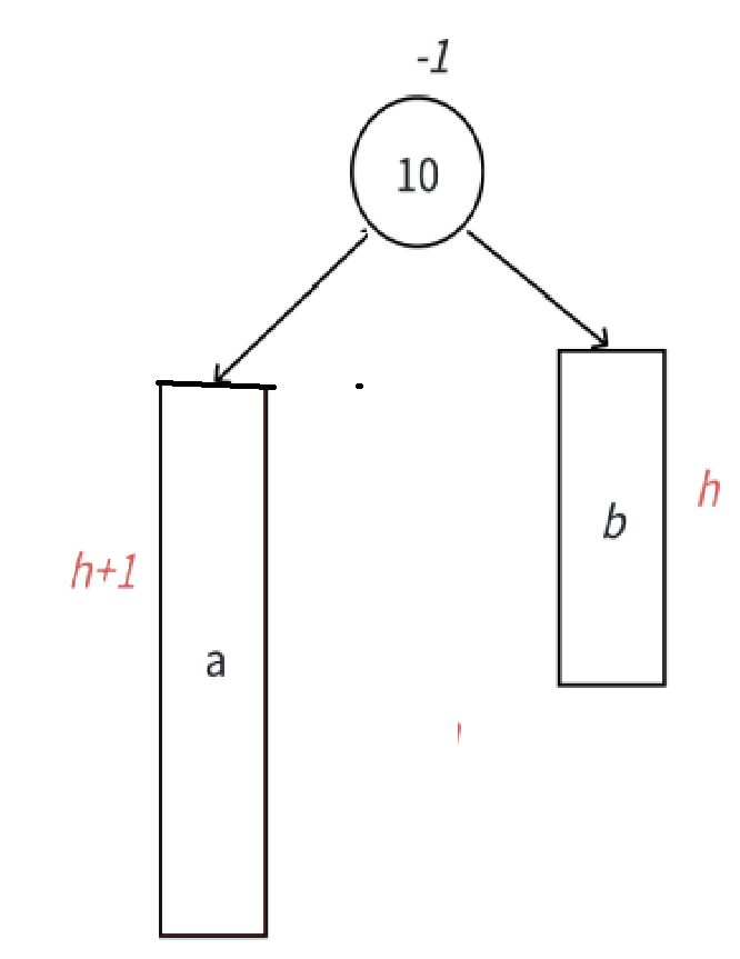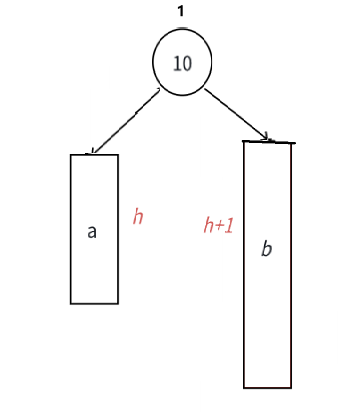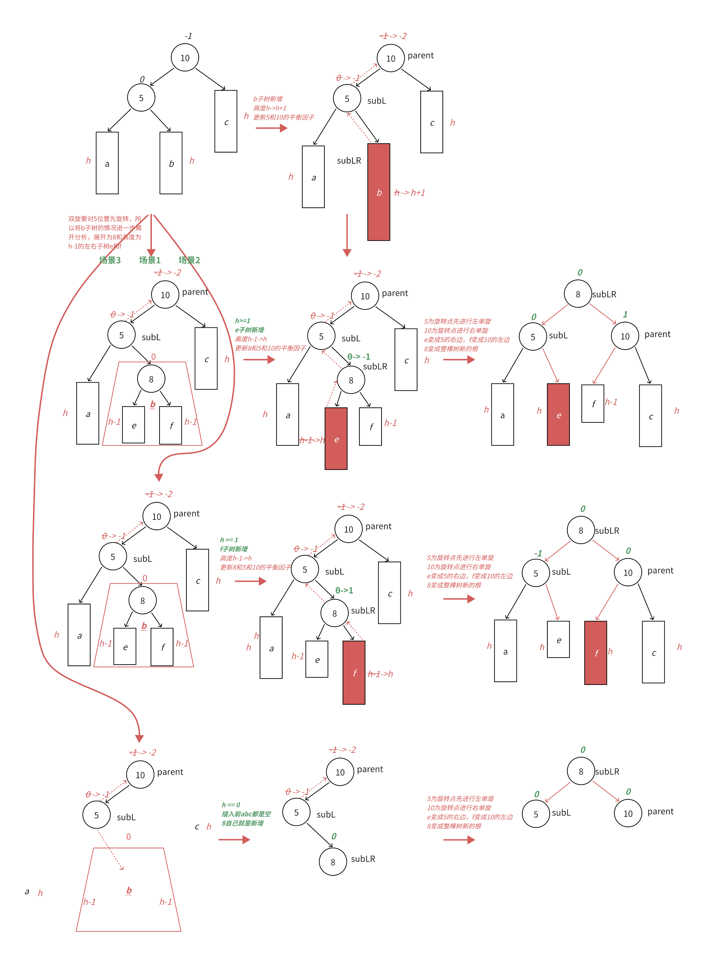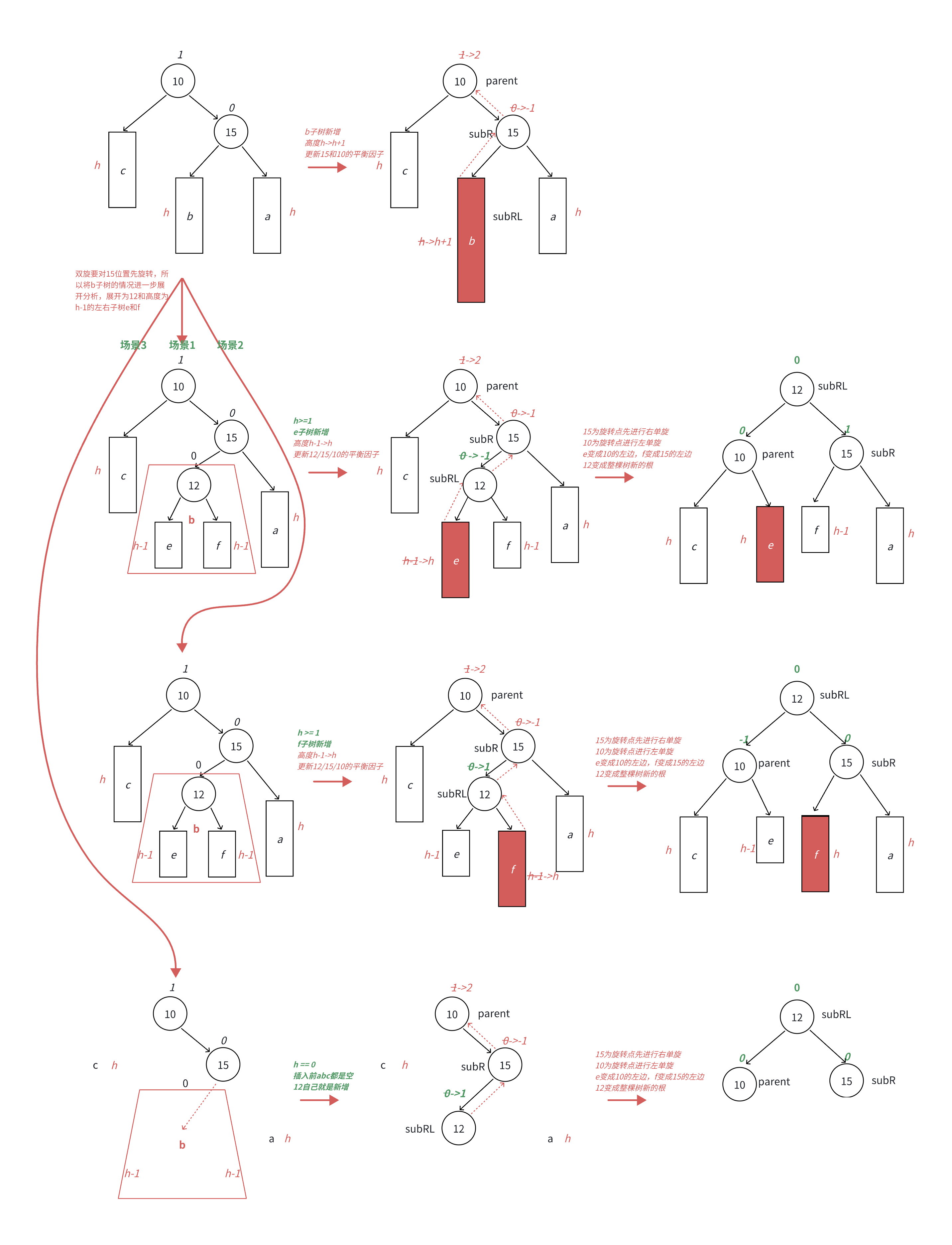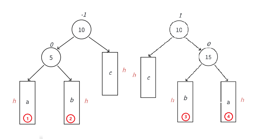 此时,10可能是整棵树的根,也可能是一个整棵树中局部的子树的根;a/b/c抽象为三棵高度为h的子树(h>=0),a/b/c均符合AVL树的要求。那由1变2,无非就是在画圈的四个地方加,正好对应我们四种情况(h=0就是一插入就不满足AVL树的要求了,而h>0就是向上调整的过程中有个节点不满足了)。