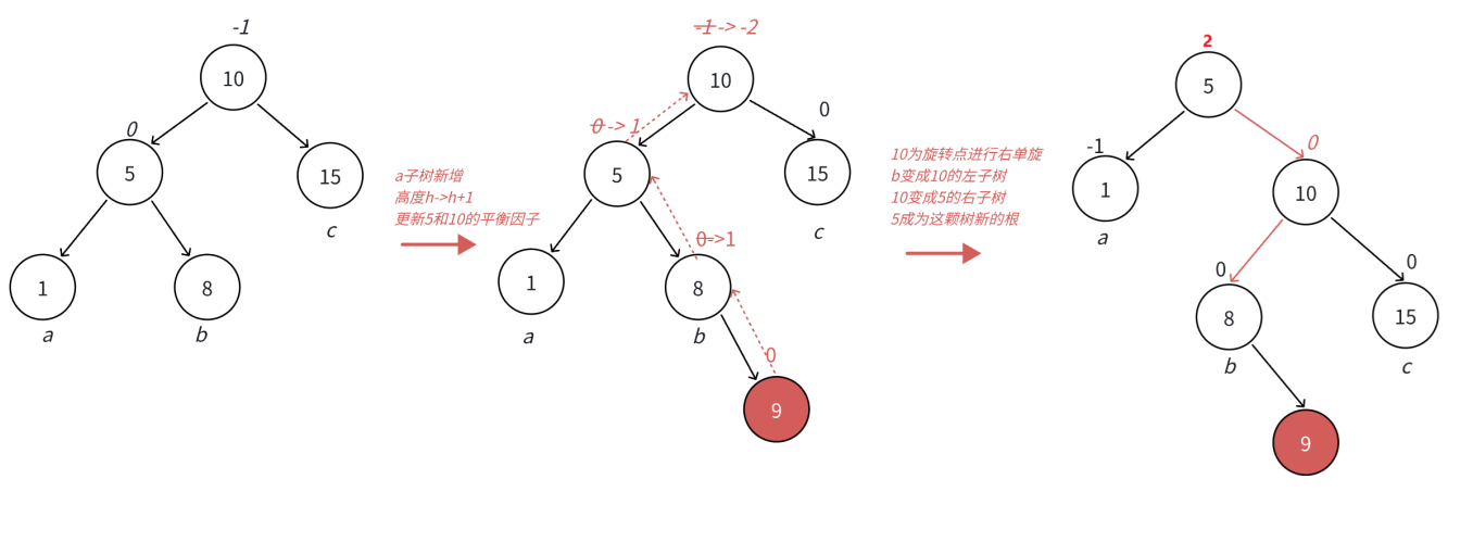 因为10 < b子树的值 < 15,将b变成10的右子树,10变成15的左子树,15变成这棵树新的根,符合搜索树的规则,控制了平衡,同时这棵树的高度恢复到了插入之前的h+2,符合旋转原则。如果插入之前10是整棵树的一个局部子树,旋转后不会再影响上一层,我们可以看到平衡因子都是0了,插入结束了。