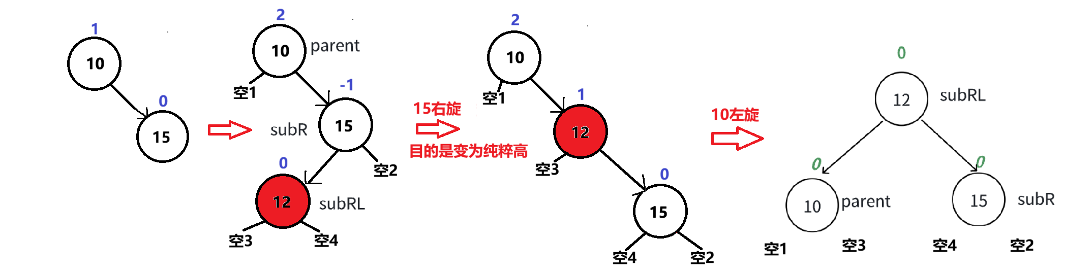 {Node* subR = parent->_right; //parent的右孩子(将成为新根)Node* subRL = subR->_left; //subR的左孩子(需要重新挂接)Node* grandparent = parent->_parent; //向上链接需要//链接新关系parent->_parent = subR;parent->_right = subRL;if (subRL) //防止原来h=0subRL->_parent = parent;subR->_left = parent;if (grandparent == nullptr) //如果parent原是整棵树的根{_root = subR;subR->_parent = nullptr;}else{ //链接关系if (parent == grandparent->_left)grandparent->_left = subR;else grandparent->_right = subR;subR->_parent = grandparent;}//重置平衡因子subR->_bf = 0;parent->_bf = 0;