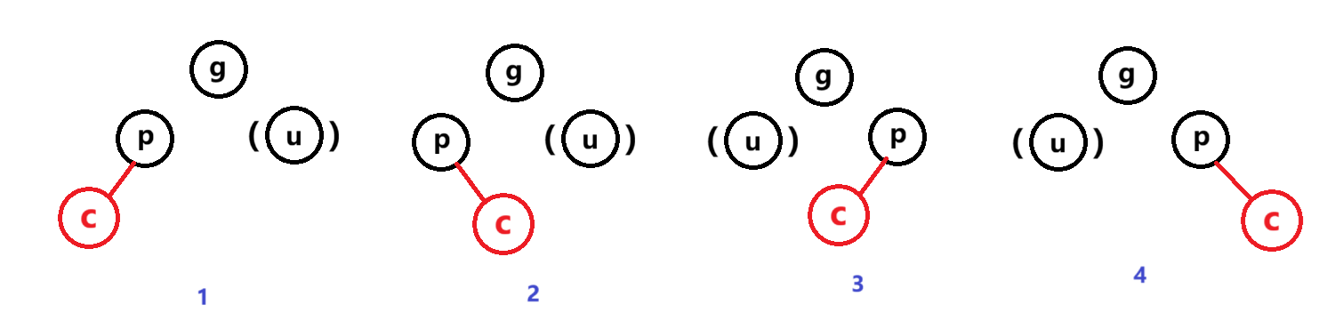 说明:下图中假设我们把新增结点标识为c (cur),c的父亲标识为p (parent),p的父亲标识为g (grandfather),p的兄弟标识为u (uncle)。