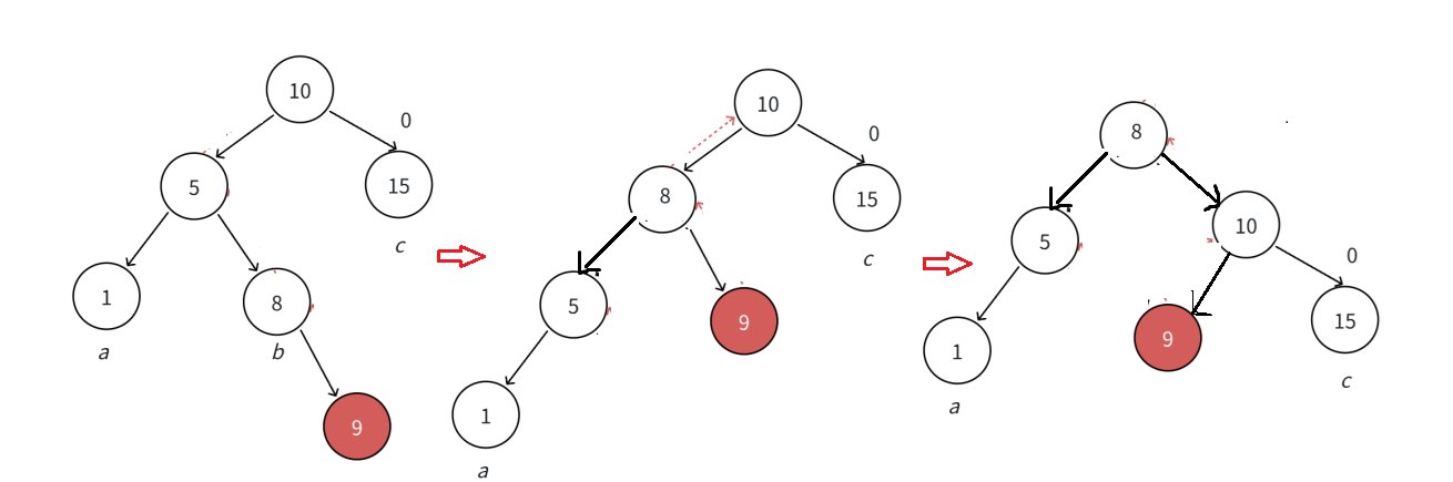因为5 < b子树的值 < 10,将b变成10的左子树,10变成5的右子树,5变成这棵树新的根,符合搜索树的规则,控制了平衡,同时这棵树的高度恢复到了插入之前的h+2,符合旋转原则。如果插入之前10是整棵树的一个局部子树,旋转后不会再影响上一层,插入结束了。