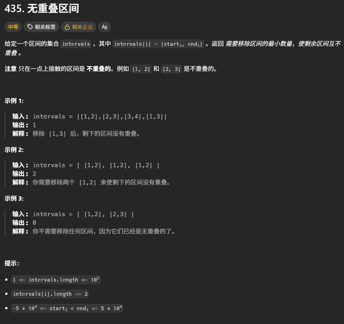 class Solution {public int eraseOverlapIntervals(int[][] intervals) {Arrays.sort(intervals,(a,b) -> {return Integer.compare(a[0],b[0]);});int count = 1;for(int i = 1;i < intervals.length;i ++){if(intervals[i - 1][1] > intervals[i][0]){intervals[i][1] = Math.min(intervals[i][1],intervals[i - 1][1]);continue;}else{count ++;}}return intervals.length - count;}