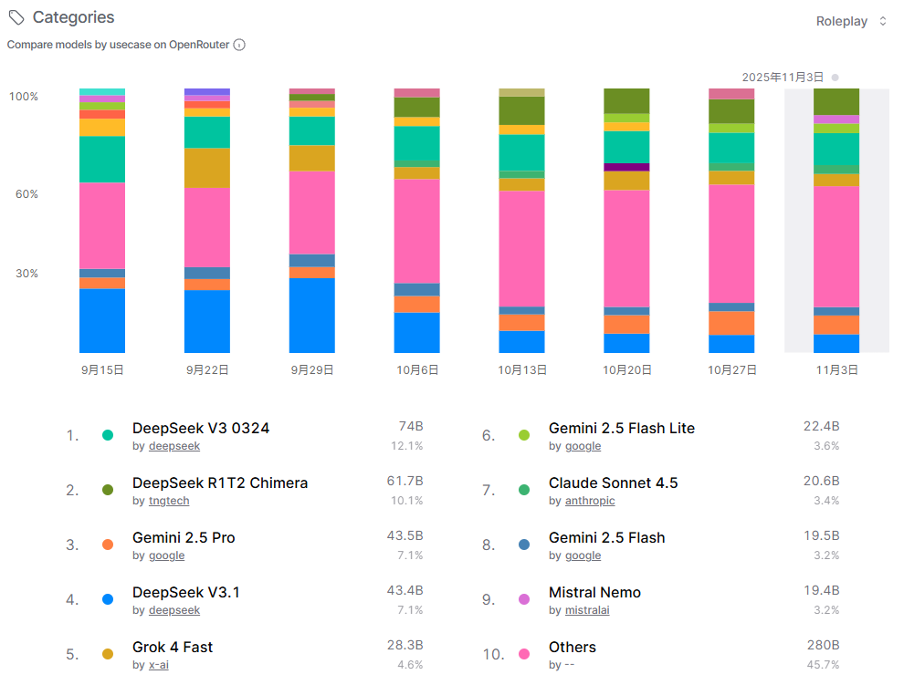 这张图片聚焦于角色扮演用例的模型对比,时间范围从9月15日至11月3日。角色扮演场景强调模型的对话生成和内容多样性,DeepSeek的模型表现突出,其中DeepSeek V3 0324以74Btoken和12.1%的份额领先,DeepSeek R1T2 Chimera以10.1%的份额紧随其后,显示出DeepSeek在娱乐化应用中的强大影响力。Google的Gemini 2.5 Pro和DeepSeek V3.1并列第三,各占7.1%,而X-AI的Grok 4 Fast和Anthropic的Claude Sonnet 4.5也占有一定份额。值得注意的是,“其他”类别占比高达45.7%,说明角色扮演市场高度分散,用户偏好多样化,长尾模型占据近半壁江山。趋势图显示份额波动较大,可能源于用户对新鲜内容和模型更新的快速响应,整体上角色扮演用例正成为OpenRouter生态中增长活跃的领域。