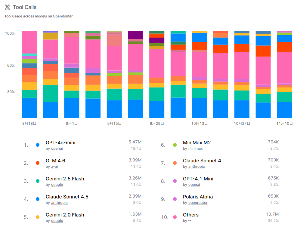 这张图片聚焦于OpenRouter平台上各模型的工具调用情况,时间范围从8月18日至11月10日。工具调用是衡量模型功能扩展性的关键指标,数据显示,OpenAI的GPT-4o-mini以5.47M次调用和18.4%的份额领先,表明其在工具集成方面的优势。Z-AI的GLM 4.6和Google的Gemini 2.5 Flash分别以11.4%和11.0%的份额紧随其后,显示出多模型竞争的态势。Anthropic的Claude Sonnet系列也有显著表现,合计占10.4%。此外,“其他”类别占比高达36.2%,说明工具使用分散 across numerous models,反映了用户对多样化功能的需求。趋势图显示调用量波动较大,可能受模型更新或用户偏好变化影响,整体上工具调用正成为平台的重要应用场景。