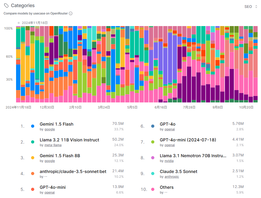 这张图片聚焦于SEO(搜索引擎优化) 这一具体应用场景,对比了不同模型在相关内容生成上的使用情况,数据时间范围延伸至2025年11月3日。趋势图显示,SEO类别的模型使用量从2024年11月至2025年10月期间,整体呈现先显著增长后在高位波动的态势,反映出市场对AI驱动SEO内容的需求日益强烈。在模型份额分布上,Anthropic的Claude Opus 4以24.2% 的绝对优势领先,共计3.92Btoken,这表明其在生成符合搜索引擎偏好、高质量结构化内容方面获得了用户的高度认可。Google的Gemini系列则展现了集团优势,其多个变体(包括Flash Preview、Flash Lite Preview、Flash、Flash Lite及Pro版本)共占据前10名中的5席,虽然单个模型份额在3.0%至3.9%之间,但总和极为可观,凸显了Google自身在搜索生态与语言模型结合上的天然优势。此外,OpenAI的GPT-4o-mini和MiniMax的M2也榜上有名。值得注意的是,“其他”类别占比也达到24.2%,与第一名份额持平,这说明SEO任务需求多样且分散,仍有大量长尾模型在被特定用户群体所采用。
