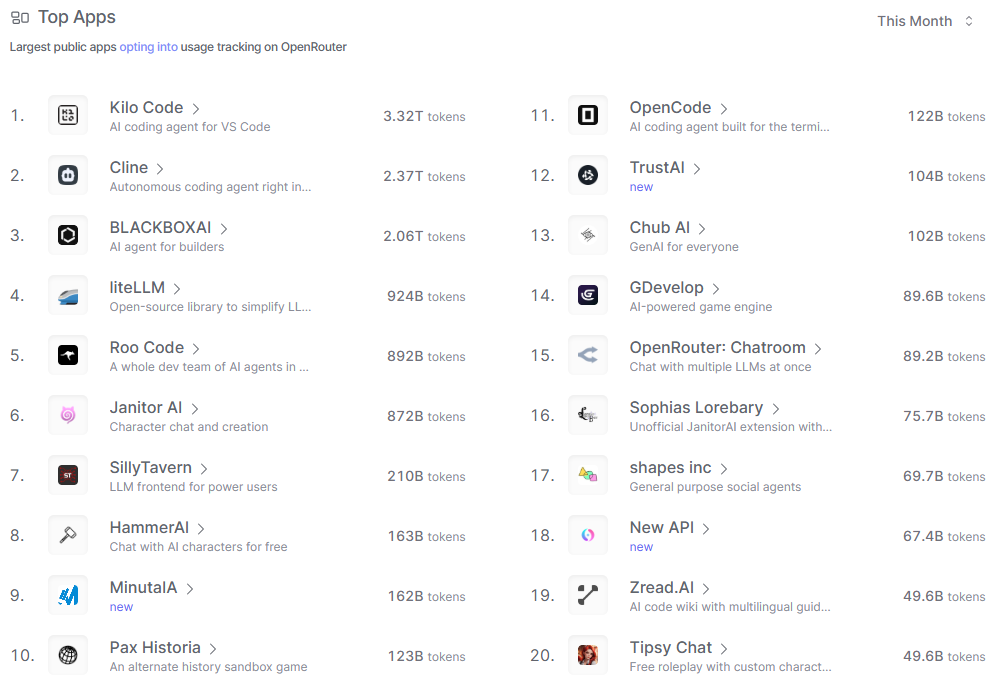 这张图片列出了OpenRouter平台上选择加入使用跟踪的顶级公共应用程序,共计20个。这些应用涵盖了多种类型,其中以AI编码代理为主,如Kilo Code、Cline和BLACKBOXAI,突出了开发工具在OpenRouter生态中的核心地位。此外,角色扮演和聊天应用(如Janitor AI、SillyTavern和HammerAI)也显著,显示了娱乐和社交场景的广泛应用。开源库如liteLLM和游戏类应用如Pax Historia进一步丰富了生态多样性。值得注意的是,部分应用标记为“new”(如MinutalA、TrustAI和New API),表明平台不断有新成员加入,推动创新。整体上,这张图表揭示了OpenRouter作为多模型集成的枢纽,正被广泛应用于代码开发、内容创作和游戏等领域,反映了AI技术的普及和用户需求的多元化。
