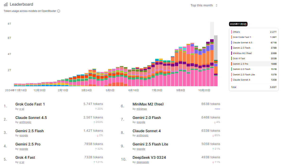 这张图片展示了OpenRouter平台上本月(截至2025年1月)的模型token使用量总排行榜。趋势图显示,从2024年11月至10月,平台整体token使用量维持在高位活跃区间(约27至87的指数水平),并在近期趋于稳定,表明用户对模型服务的需求持续旺盛。在具体模型排名上,X-AI的Grok Code Fast 1位列第一,凸显其在代码生成等专业任务中的统治性地位。Anthropic的Claude Sonnet 4.5和Google的Gemini 2.5 Flash紧随其后,分列二、三名,反映出这三家厂商的模型在综合应用场景中占据用户首选。值得注意的是,Google模型在Top 10中占据四席(包括Gemini 2.5 Pro、Flash Lite和2.0 Flash),显示出其产品矩阵的广度与市场渗透力。此外,X-AI的Grok 4 Fast、MiniMax的免费模型M2以及DeepSeek的V3 0324也跻身前十,体现了市场在追求高性能的同时,对免费或高性价比模型也存在稳定需求。总榜格局呈现出“专业模型领跑、通用模型紧跟”的竞争态势。