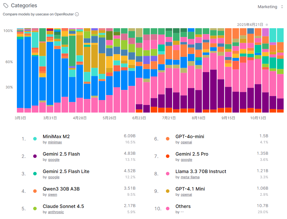 这张图片呈现了营销用例的模型对比,时间跨度从3月3日至10月13日。营销任务注重内容创作和推广效果,MiniMax M2以6.09Btoken和16.5%的份额位居第一,彰显了其在生成营销文案和策略方面的专业能力。Google的Gemini系列表现强劲,Gemini 2.5 Flash和Gemini 2.5 Flash Lite分别以13.1%和12.2%的份额位列第二、三位,显示出Google模型在多媒体营销中的综合优势。Qwen和Anthropic的模型份额相对较小,而OpenAI和Meta-LLama的模型也进入前十,但“其他”类别占29.0%,表明营销市场存在较多竞争者。趋势图显示份额分布相对平稳,反映出营销任务对模型的稳定性和创意输出有较高要求,头部模型如MiniMax M2和Google Gemini系列通过持续优化保持了用户忠诚度。