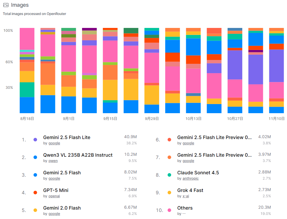 这张图片呈现了OpenRouter平台处理的图像总量,时间范围从8月18日至11月10日。图像处理是视觉AI模型的核心能力,Google的Gemini系列表现突出,其中Gemini 2.5 Flash Lite以40.9M张图像和38.2%的份额位居第一,彰显了Google在多媒体处理领域的领先地位。Qwen的Qwen3 VL模型以10.2M张和9.5%的份额位列第二,而OpenAI的GPT-5 Mini和Google的其他Gemini变体也贡献了较大份额。前10名中,Google模型占据了多个席位,合计份额超过60%,显示出高度集中性。Anthropic和X-AI的模型份额相对较小,“其他”类别占19.0%,表明图像处理市场主要由少数头部模型主导,但长尾模型仍有一定空间。趋势图显示处理量总体增长,反映了图像生成和分析需求的上升。
