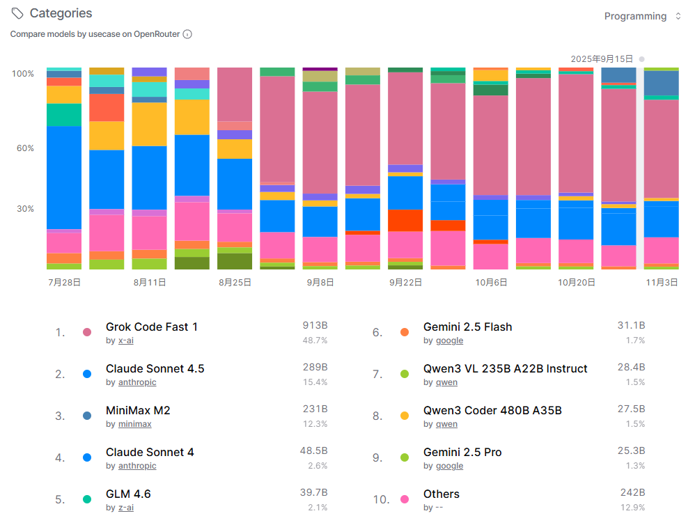 这张图片展示了OpenRouter平台上编程用例的模型对比,数据时间范围从7月28日至11月3日。在编程领域,Z-AI的Grok Code Fast 1模型以913Btoken和48.7%的份额占据绝对主导地位,几乎占据半壁江山,凸显了其在代码生成和开发任务中的高度专业化优势。Anthropic的Claude Sonnet 4.5以289Btoken和15.4%的份额位列第二,而MiniMax M2以231Btoken和12.3%紧随其后,显示出多模型竞争的态势。前10名中,Claude Sonnet系列、Z-AI的GLM 4.6以及Google和Qwen的模型份额相对较小,但“其他”类别仍占12.9%,反映了编程用例中用户对模型的选择较为集中,头部模型如Grok Code Fast 1凭借其针对性优化成为开发者的首选。趋势图显示份额分布相对稳定,表明编程任务对模型性能要求较高,市场格局不易变动。