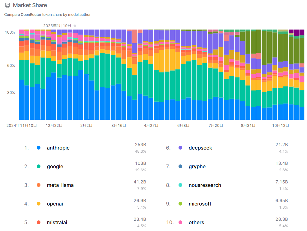 这张图片展示了OpenRouter平台上不同模型作者的token市场份额对比,数据截至2025年1月19日。从趋势图来看,市场份额在时间序列上(从2024年11月10日至10月12日)呈现动态变化,但整体格局稳定。具体份额分布中,Anthropic以253Btoken和48.3%的份额占据主导地位,几乎占据半壁江山,显示出其模型在用户中的广泛采用。Google以103Btoken和19.6%的份额位列第二,而Meta-LLama、OpenAI和MistralAI分别以7.9%、5.1%和4.5%的份额跟随其后。值得注意的是,DeepSeek、Gryphe和NousResearch等新兴作者份额较小,但“其他”类别仍占5.4%,反映了市场存在长尾分布,竞争多元。总体而言,Anthropic和Google作为头部玩家,主导了token消费,而其他作者则在细分领域争夺份额。