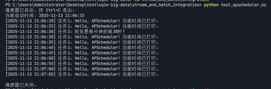 except (KeyboardInterrupt, SystemExit):# 捕获 Ctrl+C 中断信号print("\n调度器已关闭。")# 如果任务被持久化,可以在这里关闭scheduler.shutdown()
