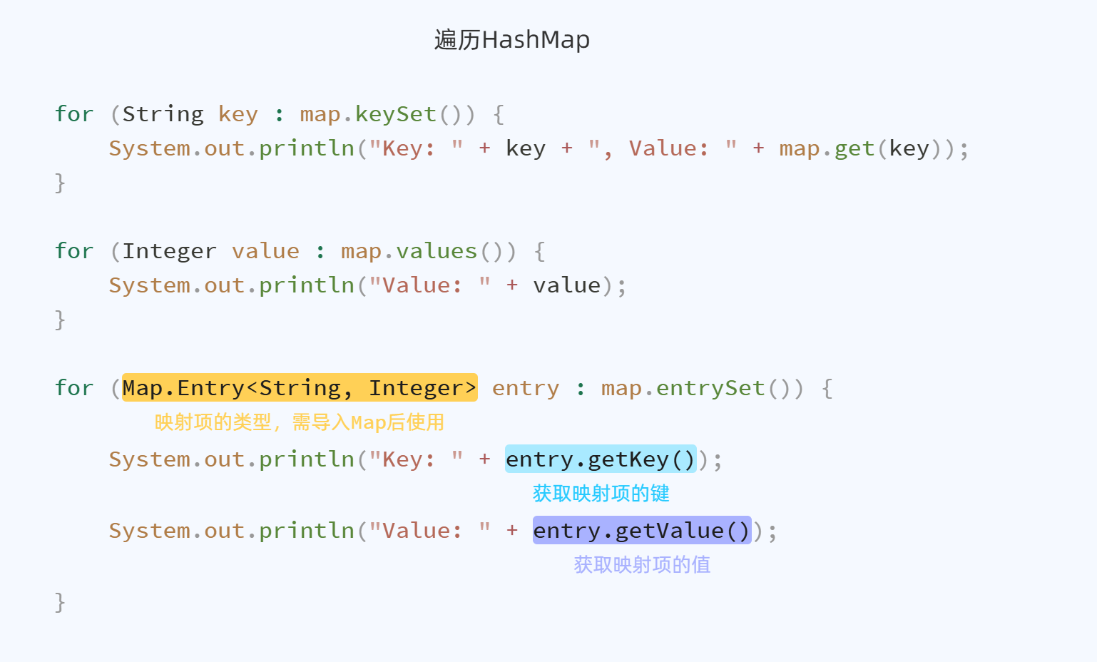 for (Map.Entry<String, Integer> entry : map.entrySet()) {// 输出键System.out.println("Key: " + entry.getKey());// 输出值System.out.println("Value: " + entry.getValue());