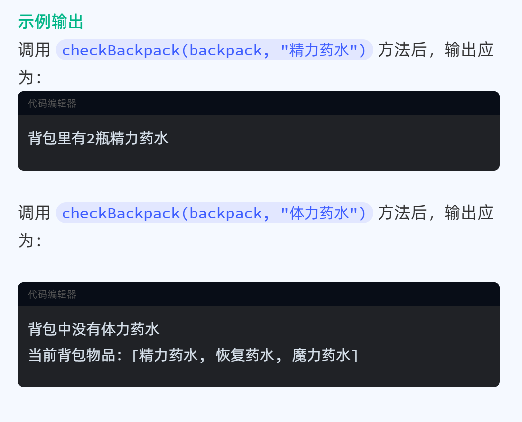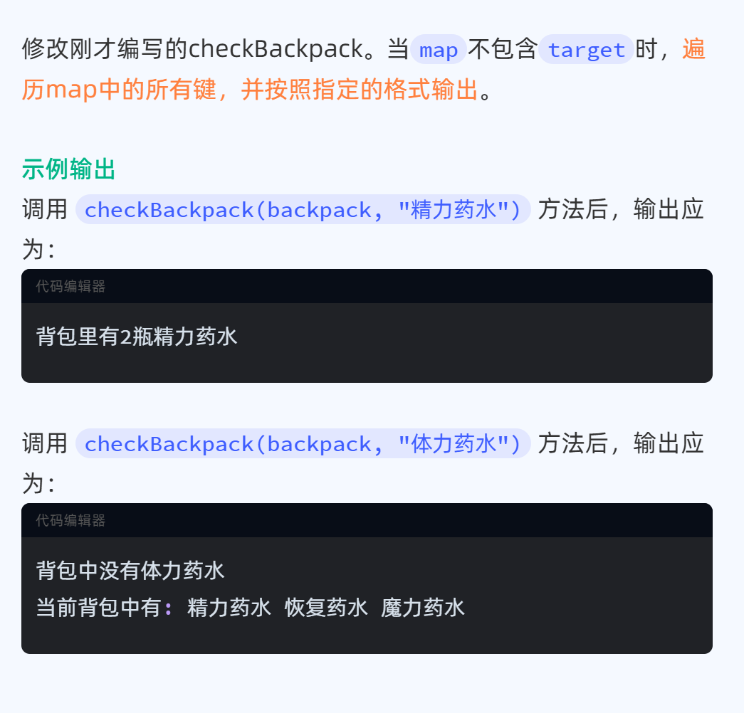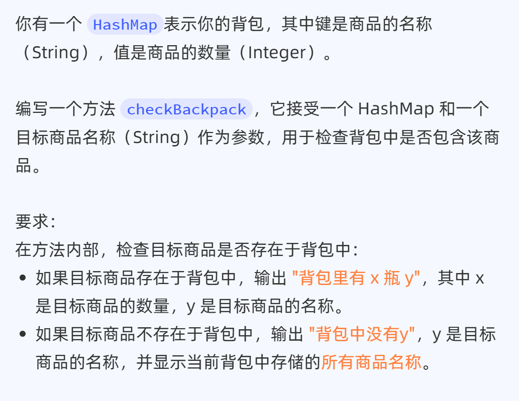 import java.util.HashMap;public class MyTest {// 编写checkBackpack方法:public static void checkBackpack(HashMap<String, Integer> map, String target) {/* 判断map是否包含target:包含:输出 背包里有x瓶y不包含:输出两行,第一行"背包中没有xxx";第二行"当前背包物品:[xxx,xxx,xxx]"*/if (map.containsKey(target)) {System.out.println("背包里有" + map.get(target) + "瓶" + target);} else {System.out.println("背包中没有" + target);Object keys = map.keySet();System.out.println("当前背包物品:" + keys);}}public static void main(String[] args) {// 创建一个HashMap表示背包HashMap<String, Integer> backpack = new HashMap<>();backpack.put("恢复药水", 3);backpack.put("精力药水", 2);backpack.put("魔力药水", 1);// 调用方法检查背包中的商品checkBackpack(backpack, "精力药水");checkBackpack(backpack, "体力药水");}