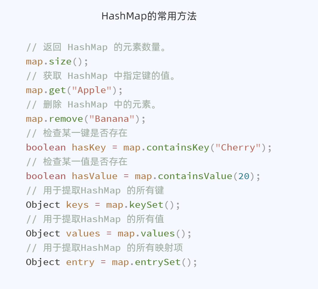 keySet()方法用于获取HashMap中所有的键;values()方法用于获取HashMap中所有的值;entrySet()方法用于获取HashMap中所有的键值对;HashMap<String, Integer> map = new HashMap<>(); map.put("Apple", 40); map.put("Banana", 10); map.put("Cherry", 20);// 获取映射的键集 System.out.println(map.keySet());// 获取映射的值集 System.out.println(map.values());// 获取映射的键值对集 System.out.println(map.entrySet());// 输出 [Apple, Cherry, Banana] [40, 20, 10] [Apple=40, Cherry=20, Banana=10]