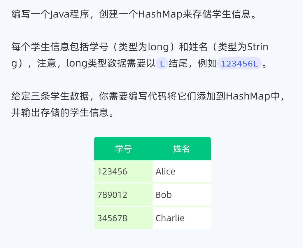 // 添加三个学生的信息到HashMapstudentMap.put(123456L, "Alice");studentMap.put(789012L, "Bob");studentMap.put(345678L, "Charlie");