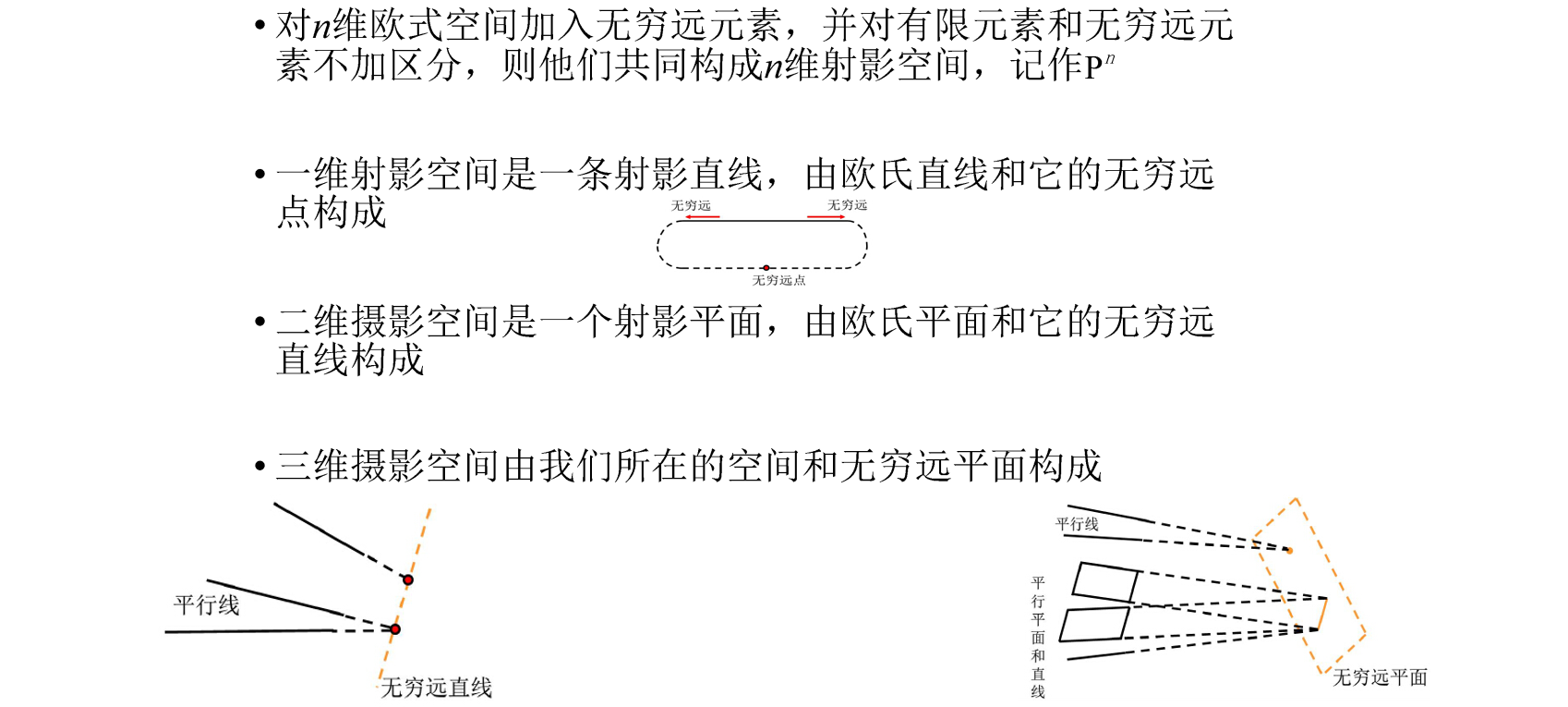 - 在一个平面上,所有的无穷远点组成一条直线,称为该平面的无穷远直线