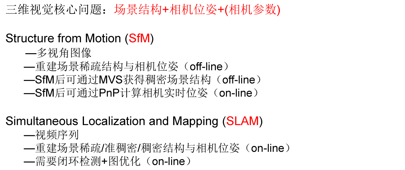 SfM:先用特征点匹配 +几何约束,只重建出稀疏的三维点(角点、特征点)和相机外参。
