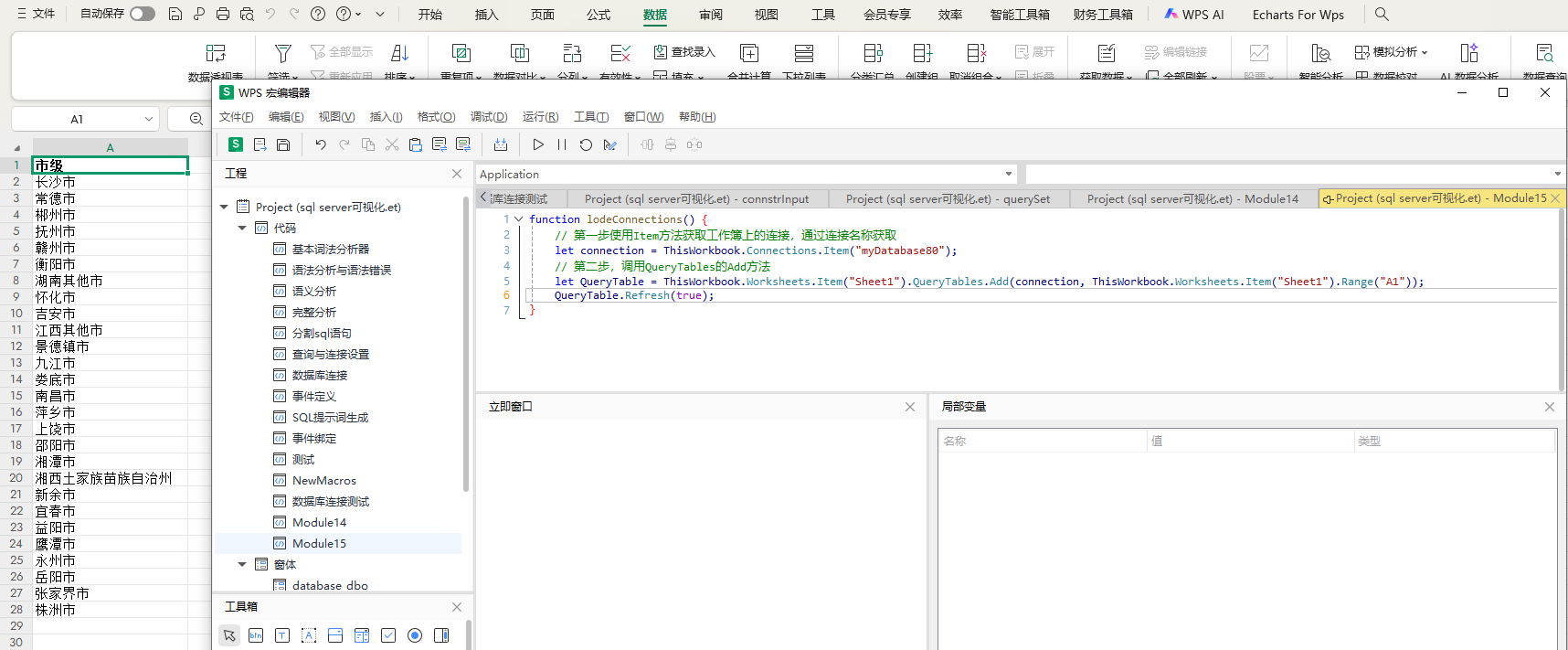function contest() {let connstr = "OLEDB;Provider=MSOLEDBSQL.1;Password=******;Persist Security Info=True;User ID=**;Initial Catalog=****;Data Source=*****;Use Encryption for Data=False;";let connectionName = "myDatabase80"; // 连接名称let description = "实例数据库"; // 对连接的简要描述console.clear();let query = "select distinct sj 市级 from uf_scrl where tbsj='2025-11-01'";let conection = ThisWorkbook.Connections.Add2(connectionName, description, connstr, query, xlCmdSql);let conn = conection.OLEDBConnection; conn.SaveAsODC("E:\\vscode\\wpsjs\\jsa_database\\myConnection.odc");conn.Refresh(true);conn.MaintainConnection = false; //关闭连接
