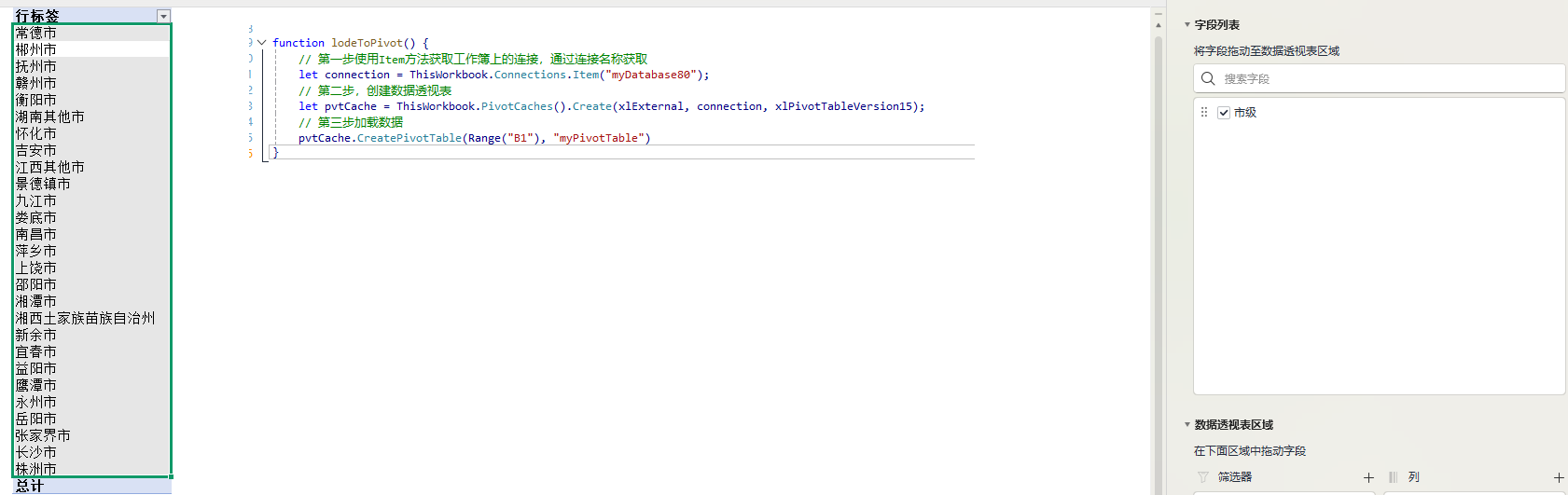 function lodeToPivot() {// 第一步使用Item方法获取工作簿上的连接,通过连接名称获取let connection = ThisWorkbook.Connections.Item("myDatabase80");// 第二步,创建数据透视表let pvtCache = ThisWorkbook.PivotCaches().Create(xlExternal, connection, xlPivotTableVersion15);// 第三步加载数据pvtCache.CreatePivotTable(Range("B1"), "myPivotTable")