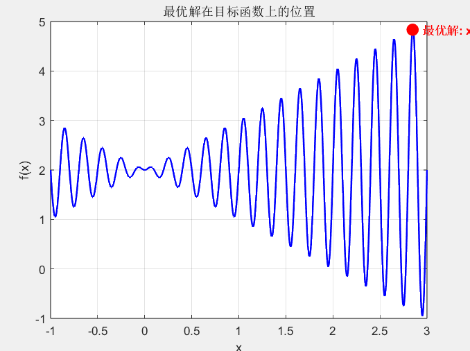xlabel('x'); ylabel('f(x)'); title('最优解在目标函数上的位置');%% 结果解读
