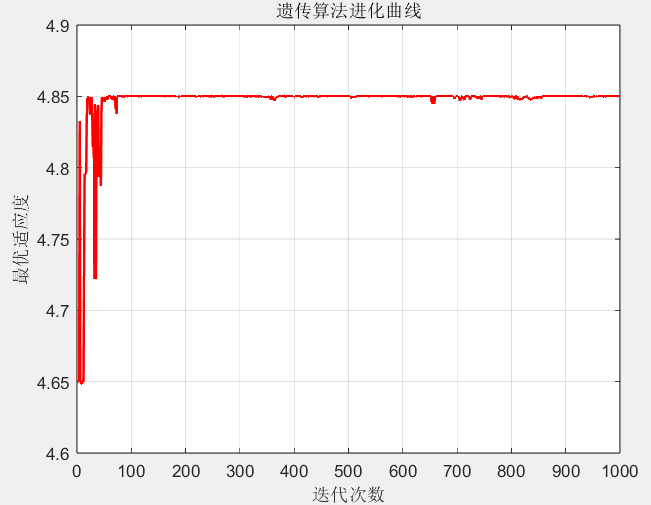 xlabel('迭代次数'); ylabel('最优适应度'); title('遗传算法进化曲线');